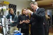 Senator Scott Brown (R-Mass) observes a demonstration by Materials Science and Engineering and Biology Engineering Professor Angela M. Belcher during a tour of the Institute for Soldier Nanotechnologies at MIT.