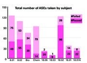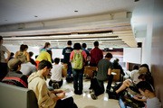 Freshmen stand, kneel and sit on the floor at the back of 26-100 during the first lecture of 7.012. The fall semester biology GIR spilled over the 566-seat capacity of 26-100, though there was no overflow room, as is typical for the class.