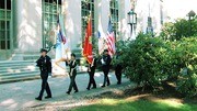 At the end of Sunday’s ceremony, an ROTC/MIT Police Joint Honor Guard raised an American flag to the top of the flagpole in Killian Court, then lowered it to half-mast.