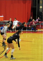 Natasha H. Jensen ’12 (near), Katie K. Spielbauer ’13 (middle), and Trinity P. Leonard ’13 (far) await the return of the ball during Tuesday night’s volleyball game.