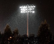 The season’s first flakes of snow float through the lights shining over Steinbrenner Stadium on Wednesday night.