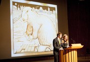 Stephen T. Frost ’13 and Caitlin R. Pomeroy ’13 unveil the bezel of the 2013 Brass Rat on Friday night. The bezel features the beaver, who clutches a branch with four leaves, and a framing square in the shape of a seven. The beaver sits atop eight ivy leaves.