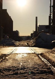 Railroad crossing on Mass. Ave. near Vassar Street, shot looking directly into the late afternoon sun. The Metropolitan Storage Warehouse is visible on the left; smokestacks from the Francis Bitter Magnet Lab stand on the right side of the picture. The strong backlighting provided by the sun silhouettes the buildings and is reflected in the exposed railroad tracks and the melting snow.