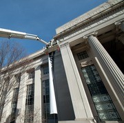 Workers take down the MIT150 banners hanging from the facade of the entrance to Building 7 Monday morning.