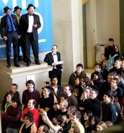 Mystery Hunt participants gather in Lobby 7 last Friday at noon to receive instructions before they begin solving puzzles. They learned that the theme of this year’s hunt is making bad Broadway musicals, based on the plot of The Producers. The puzzles were created and organized by Borbonicus and Bodley, winners of last year’s Mystery Hunt.
