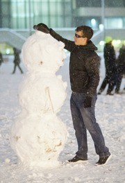 Bruno B. F. Faviero ’15, a Tech staffer, tops a newly constructed snowman with a hat on Monday evening in front of the Student Center. Light snowfall blanketed Cambridge on Monday evening.