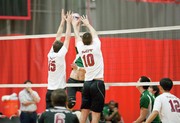 Patrick J. Vatterott ’13 and David R. Thomas ’12 block a shot during the men’s volleyball match against Lesley University on Feb. 21. MIT won 25-9, 25-17, and 25-17 to improve their record to 16-4 overall.