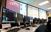 Rows of computer monitors and a massive screen on the rear wall in the control room display crucial data about the tokamak system.