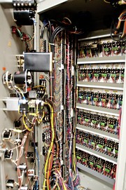 Wiring for the massive alternator, housed in an adjoining building, which provides power to the tokamak during experiments. The alternator, which was donated to the laboratory by Con Edison in 1978 is hooked up to a 75-ton flywheel and provides a peak power of more than 100 megawatts during experiments.