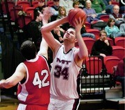 Noel Hollingsworth ’12, the team’s center, takes a shot against a stumbling RPI defender.