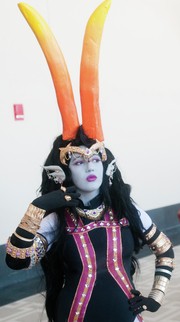 A cosplayer dressed as Betty Crocker aka Her Imperious Condescension from Homestuck poses for the camera.