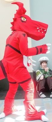 An attendee cosplays as Guilmon, from the TV series Digimon.