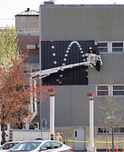 Workers install an image on the side of N52, the MIT Museum, for an exhibit in the Kurtz Gallery — Berenice Abbott, Photography and Science: An Essential Unity, which runs May 3, 2012 through Dec. 31, 2012.