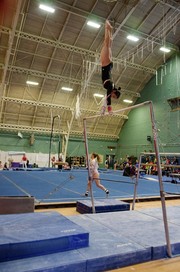 Zara K. Karuman ’13 performs a routine on the uneven bars during Saturday’s gymnastics meet in Dupont.