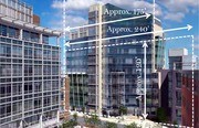 Permitted building widths (façade lengths) with associated building heights, overlayed over 40 Landsdowne Street, a building with a 27,500 square foot floorplate.