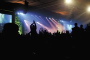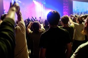 The audience cheers for the start of the concerts on Saturday night at the BCEC.