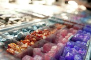 A colorful variety of polyhedral dice for sale at a booth on the exhibit floor of the convention hall.