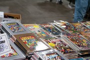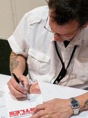 Teenage Mutant Ninja Turtles co-creator Kevin Eastman inks a sketch for a fan at his booth in the main hallway.