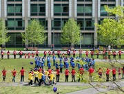 MIT students, faculty, staff, and local students participate in a biology flash mob in front of the Koch Building. Participants reenacted targeted drug delivery to a cancer cell as a part of the Cambridge Science Festival on Thursday after