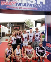 The MIT Triathlon Club poses beneath the finishing chute at the USA Triathlon Collegiate National Championships.