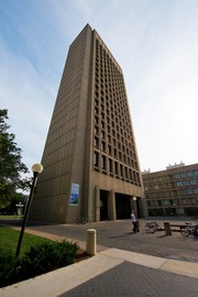 This photo of Building 54 was taken on Friday, Aug. 24 in the early afternoon with the bright sun overhead. A wide angle 14–24mm lens lent a unique perspective to the Green Building, a common sight to most on campus. The wide angle achieved by opening the lens up to 14mm allowed the opportunity to include the entire building in the frame while avoiding the distortion seen with fisheye lenses that are often used to attain similar wide angles.