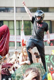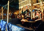 A crowd of party-goers cheers on two students wrestling in a tub of soap, water, and glitter during the East Side party on Monday, August 27.