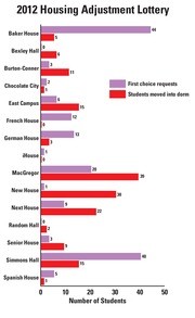 “First choice requests” refers to the number of freshmen who requested a given dorm as their first choice in the adjustment lottery; “Students moved into dorm” is the number who actually moved in. Not all students received their first choice.