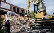 A construction crew demolishes the building at 219 Vassar St. on Monday morning. The TCC Vassar childcare facility will be constructed in its place.