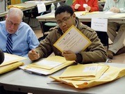 Cambridge elections workers start to receive results on Tuesday evening at the Cambridge Senior Center, 780 Massachusetts Avenue. The City’s 33 precincts deliver their counts electronically, as well as the physical ballots. Voter turnout was higher than usual in Cambridge, with some voters waiting in line for over an hour.