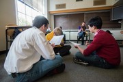 Several students crowd around a laptop to watch a movie while waiting for their first class to start.