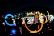 Students wind down after a long day of classes and swing lights in front of Kresge Auditorium on Saturday evening.