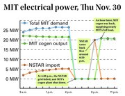 The caption to this photo states that the MIT cogeneration plant supplies "only a fraction" of the electricity used on campus. While it typically does not supply all of the electricity used on campus, it usually supplies the majority of it. Just prior to the outage on Nov. 29, 2012, it supplied 22 MW out of a total 27 MW.