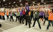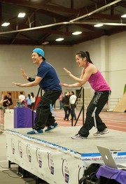 Relay participants dance in a group Zumba exercise, one of the team activities that occurred during the night.