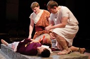 Mark Antony (Zachary D. Tribbett ’13, left) leads a Roman citizen (Salvador Esparza ‘14, right) out of a crowd to see Julius Caesar’s (Christopher D. Smith ‘13) body up close in the MIT Shakespeare Ensemble’s performance of “Julius Caesar.” The MIT Shakespeare Ensemble, composed of MIT students and community members who work together long-term to produce Shakespeare shows, are performing the play until March 23.