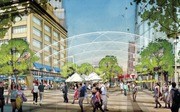 An artistic rendering of an early conception of a new gateway to MIT where the current Kendall T stop stands, across from the Marriott Hotel. The gateway is intended to mirror the prominence of 77 Mass. Ave.