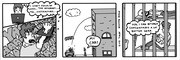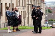 (Left to right) Albert (Gary Maitland), Robbie (Paul Brannigan), and Rhino (William Ruane) with policemen.