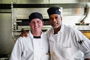 Members of the MIT Dining staff take a short break during dinner.