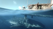 A shark nears Thor’s raft Kon-Tiki in the Pacific Ocean.