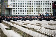A Massachusetts State Police helicopter flies over Briggs Field as part of an honorary flyover after the memorial for MIT Police Officer Sean Collier.