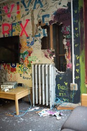 A hole in the wall of Bexley Hall’s entry 50 was part of vandalism that happened overnight in the now-closed dorm. Bexley will be undergoing extensive renovations for up to the next three years.
