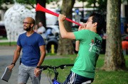 An East Campus resident announces their arrival by blowing a vuvuzela.