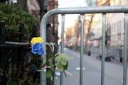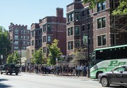 Boylston St. remained blocked off two days after the Marathon bombings. Blue and yellow flowers, representing the colors of the Boston Marathon, were tucked into the barricade near a makeshift memorial.