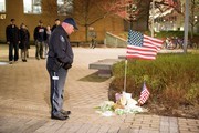 MIT police officer Kevin O’Connor paid tribute to fellow officer Sean Collier in front of Building 32 on Friday, April 19, 2013. Collier was killed near this location the previous night by the Marathon bombing suspects.
