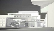 A rendering of a possible design for MIT’s new eastern “gateway” at the Kendall T stop. The gateway is intended to mirror the grandeur of 77 Mass. Ave. The larger building in the right foreground will likely be a commercial office or lab building.