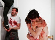 The characters played by Noah M. Arbesfeld ’13, Illan F. Halpern ’13, Cathy T. Zhang ’13, and Johari Frasier ’13 die at a party in Dramashop’s production of Margo Veil.