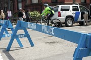 There was a heavy police presence at the Boston Marathon this year. Security checkpoints to get near the finish line were established, and many roads were blocked with police barriers and public works trucks.