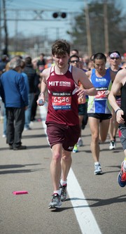MIT Strong Boston Marathon team member Thomas Brand shortly after the 10K checkpoint in Framingham. The MIT Strong team ran the Boston Marathon on Monday in honor of MIT Police Officer Sean A. Collier, who died one year ago.