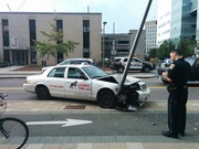 A taxi driver crashed into a light pole in front of Building 34 on Saturday afternoon. The driver told a Cambridge Police officer (pictured) that he swerved to avoid a head-on collision when a car, travelling in the opposite direction, tried to pass another car. Vassar Street only has one lane in each direction at the site of the crash.