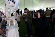 A vistor at MIT’s Mini Maker Faire uses an Oculus Rift virtual reality headset to interfact with an InMoov robot.