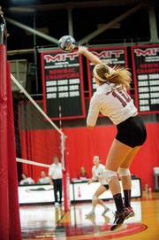Megan E. Gebhard ’17 spikes the ball in a match against Simmons College on Saturday. MIT went on to defeat Simmons 3-0.